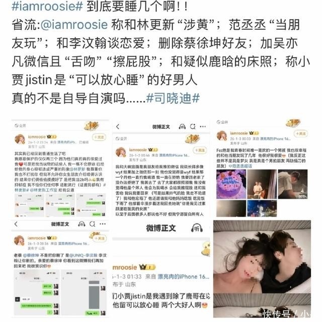女博主自曝睡遍男顶流根据资料显示,女博主iamroosie的原名叫做司晓迪,这个名字对于长期关注娱乐八卦的网友而言,并非全然陌生。